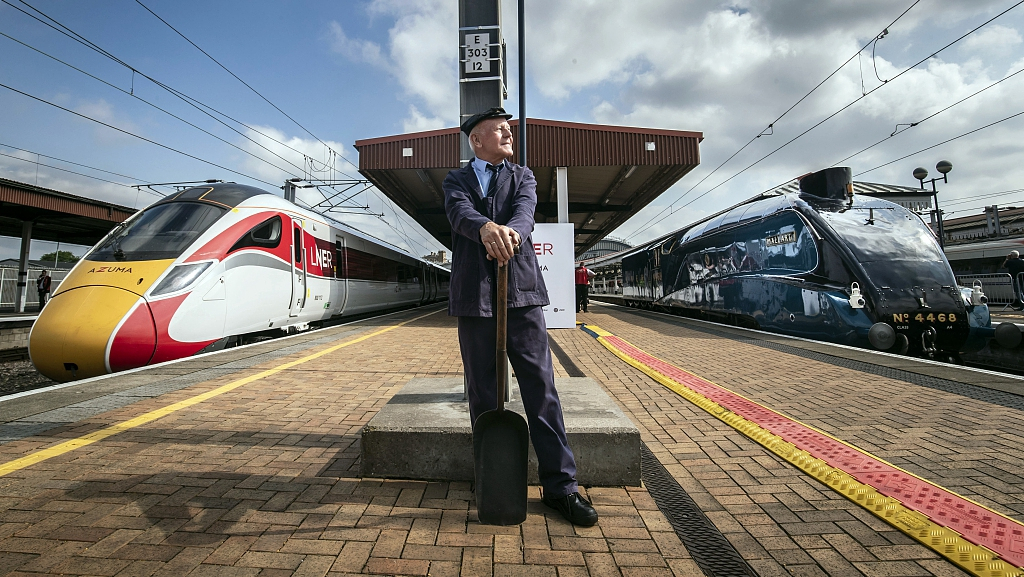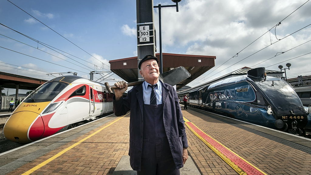 Steam traction inspector Jim Smith is pictured with a new Azuma train alongside the locomotive Mallard, holder of the world speed record for steam locomotives, at York Station in the UK. / VCG photo