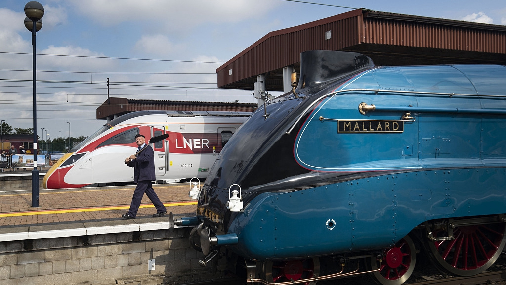 The famous steam locomotive on display is brought from the National Railway Museum as a part of Azuma train's media launch. The event is held before the new train's official debut between London, York, and Edinburgh, August 1, 2019. / VCG photo