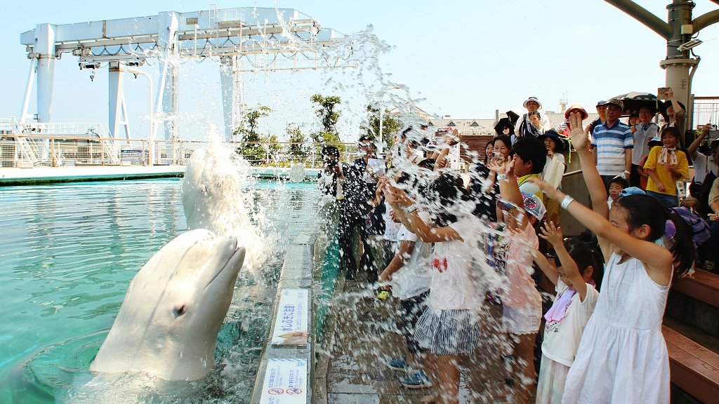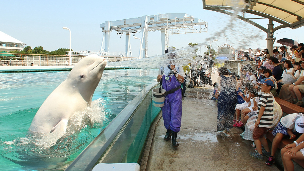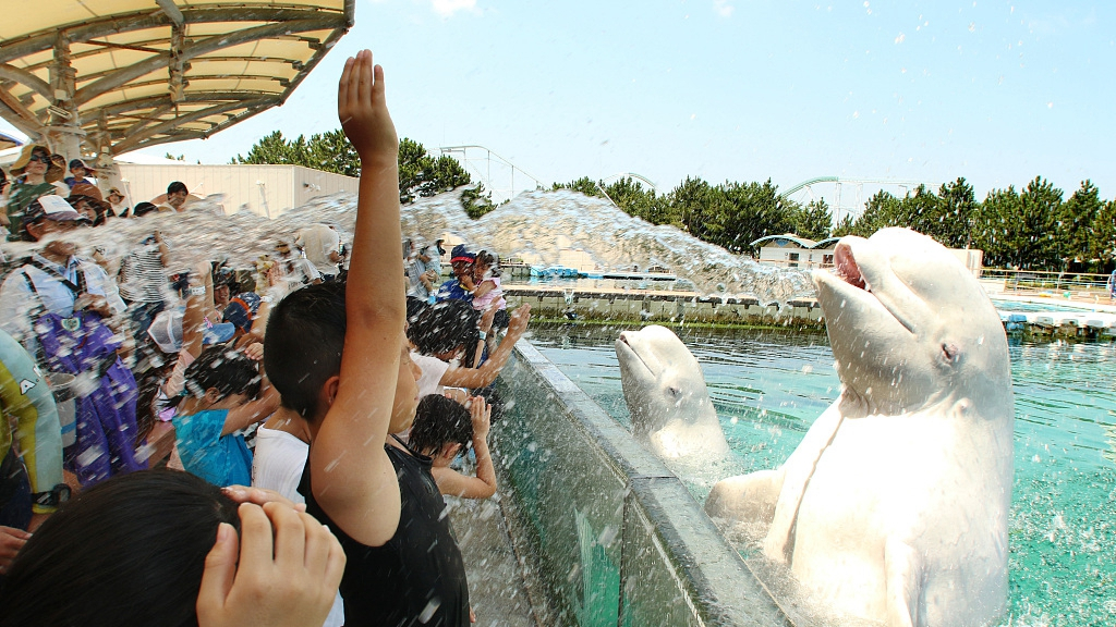 Beluga whales sprayed water onto visitors at the Hakkeijima Sea Paradise in Yokohama on Saturday. /VCG Photo