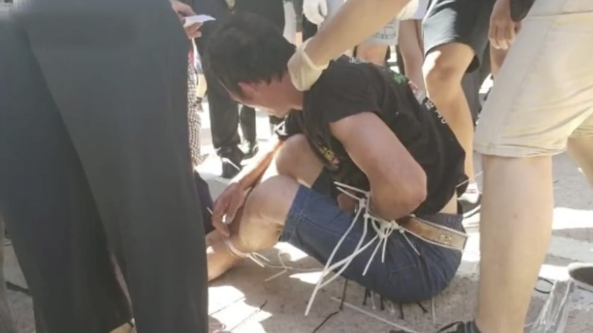 Protesters blocked roads outside the Sun Yuen Long Centre in Hong Kong on August 5, 2019. A private car was stopped and the car driver drove to break through the roadblock after being "insulted."