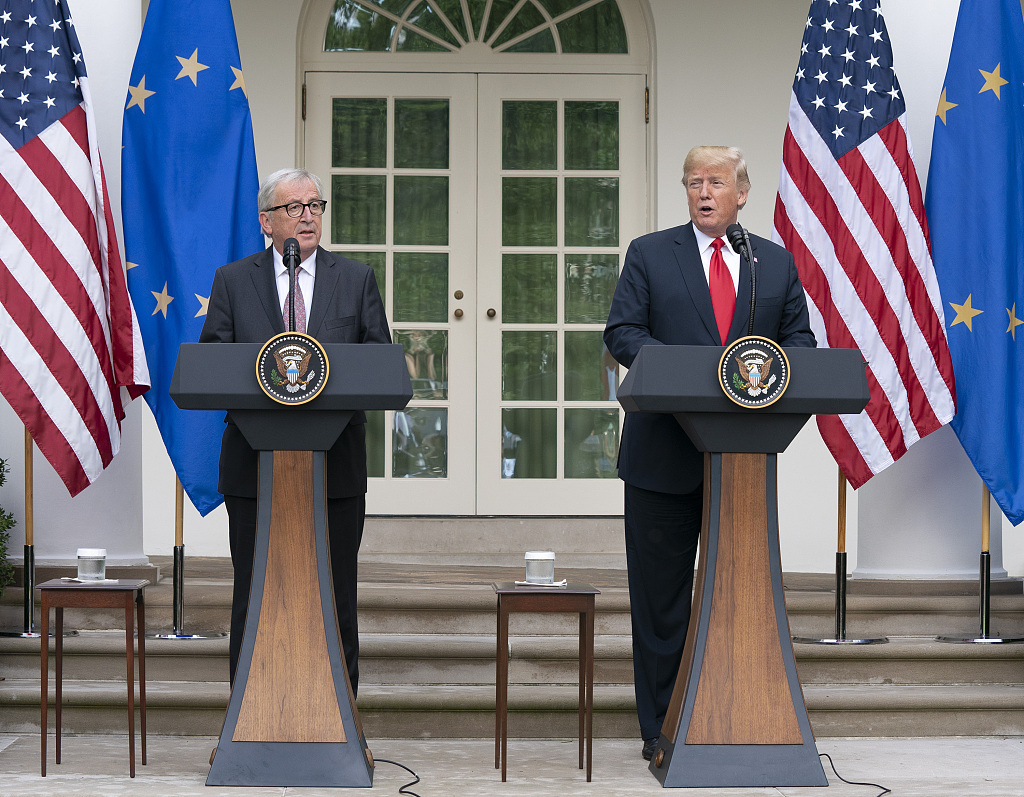 U.S. President Donald (R) Trump makes a joint statement on trade with Jean-Claude Juncker, President of the European Commission at the White House in Washington, D.C., July 25, 2018. /VCG Photo