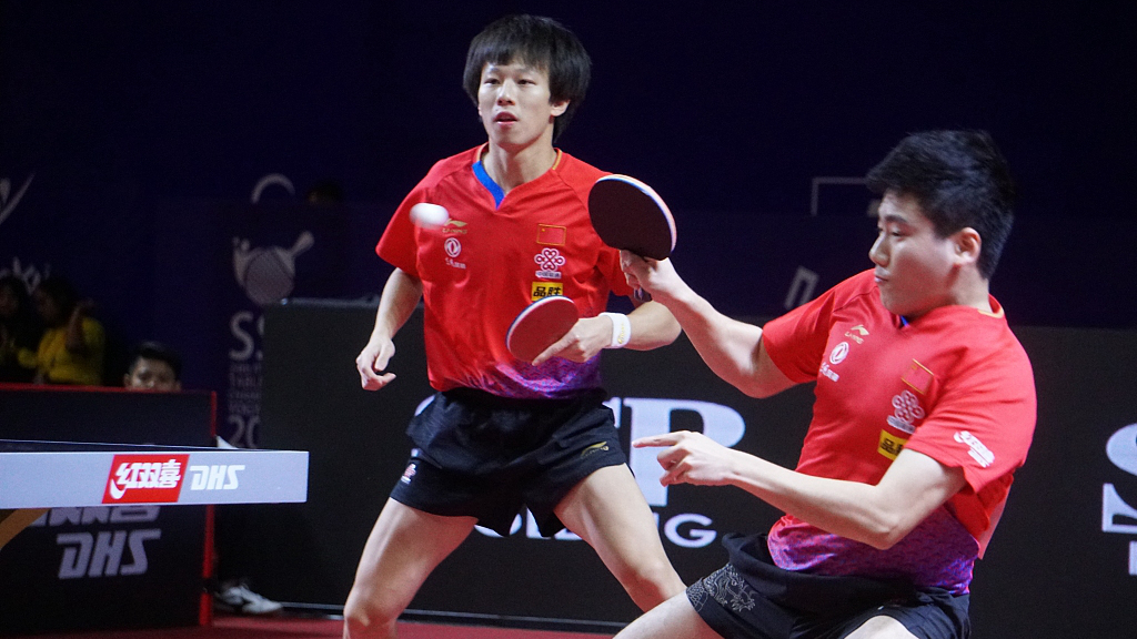 China's Xu Xin (L) and Liu Shiwen compete at mixed doubles final during the Asian Table Tennis Championships in Yogyakarta, Indonesia, September 21, 2019. /VCG Photo