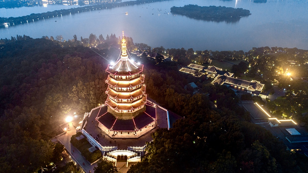 A drone show featuring 300 unmanned aerial vehicles is lighting up the night sky over Hangzhou, east China's Zhejiang Province, to celebrate the 70th founding anniversary of the People's Republic of China (PRC). The illuminated drones are forming many images, including the phrase " I love you China."