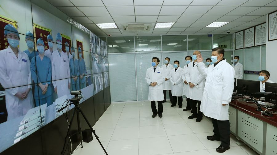 Chinese President Xi Jinping checks the treatment of hospitalized patients at the monitoring center and talks to medical staff on duty via a video link at Beijing Ditan Hospital in Beijing, capital of China, February 10, 2020. /Xinhua