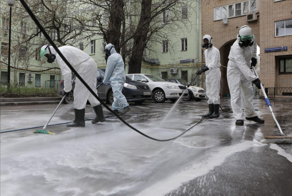 Specialists wearing protective gear spray disinfectant while sanitizing a street to prevent the spread of the coronavirus in Moscow, Russia, April 18, 2020. /Reuters