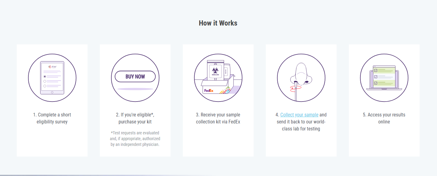 For the home test, people are initially screened with an online questionnaire. If authorized by a physician, LabCorp will ship a testing kit to their residences. The kit includes cotton swabs, a collection tube, an insulated pouch and box to ship the specimen back to LabCorp. To take a sample, a cotton swab is swirled in each nostril. The test results are posted online to a secure company website.