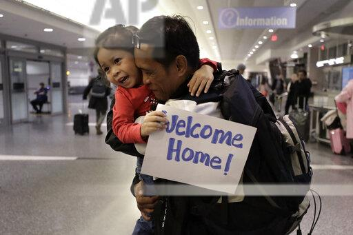 Thy Chea, of Lowell, Mass., center right, originally of Cambodia, hugs his daughter on his arrival at Boston's Logan Airport, February 26, 2020, after getting his green card reinstated last year. /AP