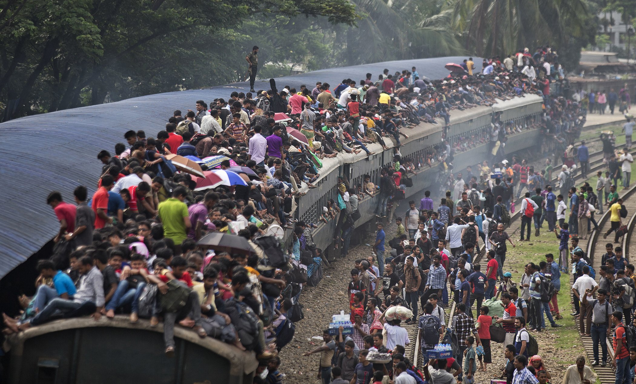 Muslims maneuver their way on the roof of an overcrowded train to travel home for Eid al-Fitr celebrations, at a railway station in Dhaka, Bangladesh, June 14, 2018. /AP