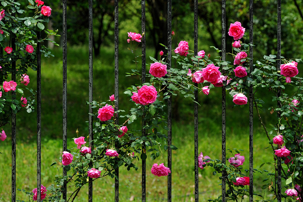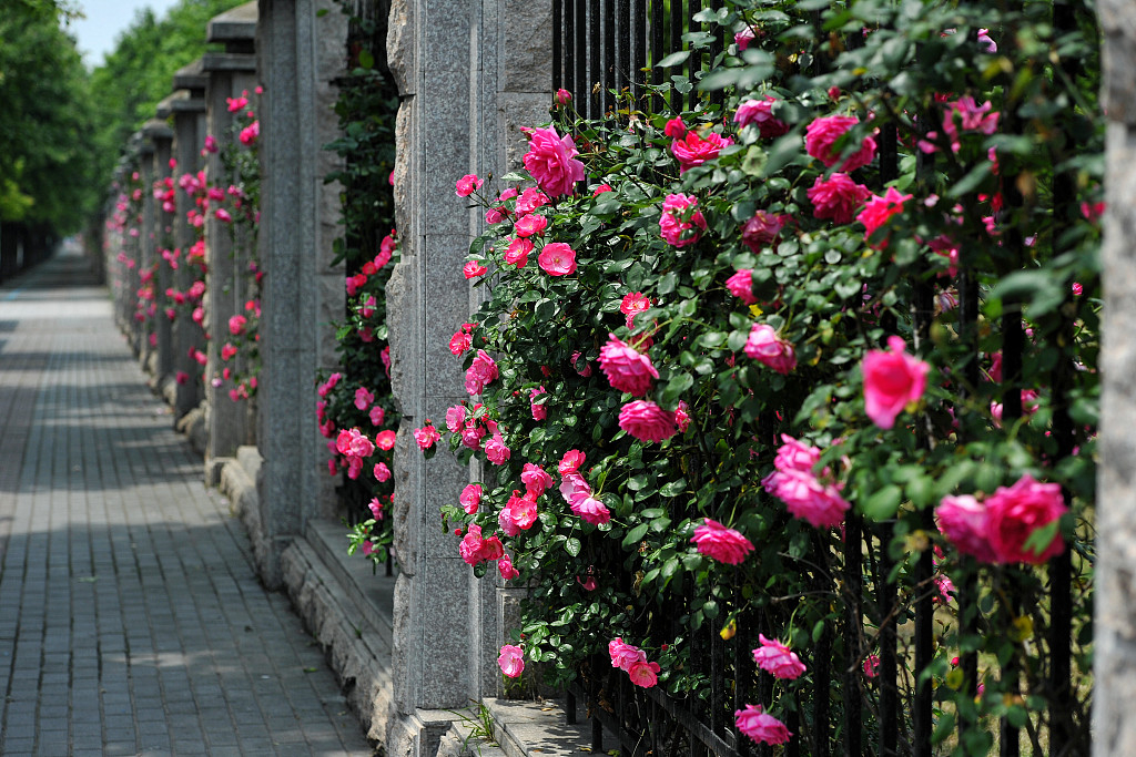 Flourishing multiflora roses have reached though iron bars along the campus wall of Zhejiang Normal University in east China's Zhejiang Province. Covered by spiraling branches and colorful flowers, the wall has become a colorful example of a harmonious mixture of city construction and natural elements.