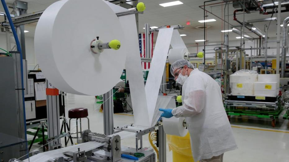 A General Motors worker monitors a Level 1 medical mask making machine, as the spread of the coronavirus disease (COVID-19) continues, at the former GM Transmission facility in Warren, Michigan, U.S., April 23, 2020. /Reuters