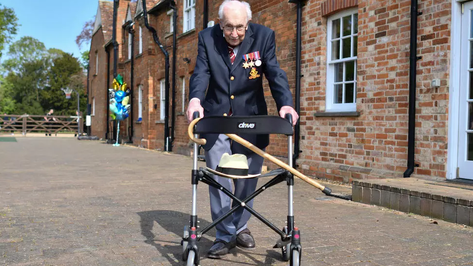 He initially set out to raise just £1,000 for Britain's National Health Service (NHS) by walking 100 laps of his 25-meter (82-foot) garden, with the help of his walking frame.
