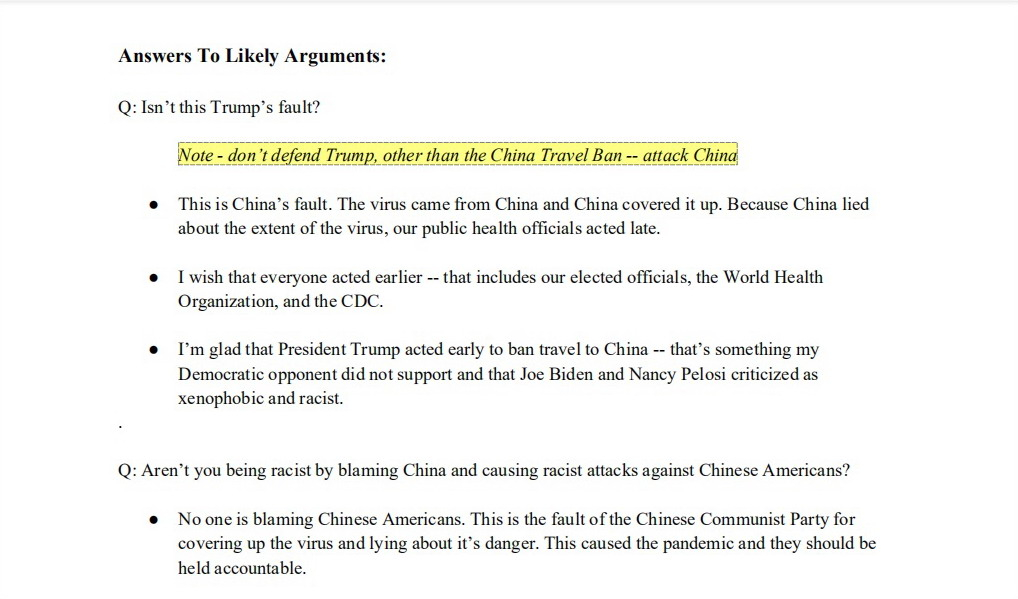 In the 57-page playbook compiled by Republican debate coach Brett O'Donnell, Republican senators and Senate candidates are told not to defend Trump when asked whether the failure is the president's fault. Instead, they should pivot to "attacking China."