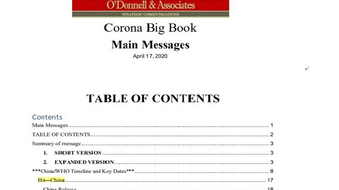 The Trump administration has come up with a propaganda playbook, the "Corona Big Book," for a unified voice in shifting attention away from its disastrous response to the coronavirus pandemic. The key point is to vent public anger by concentrating on attacking others.