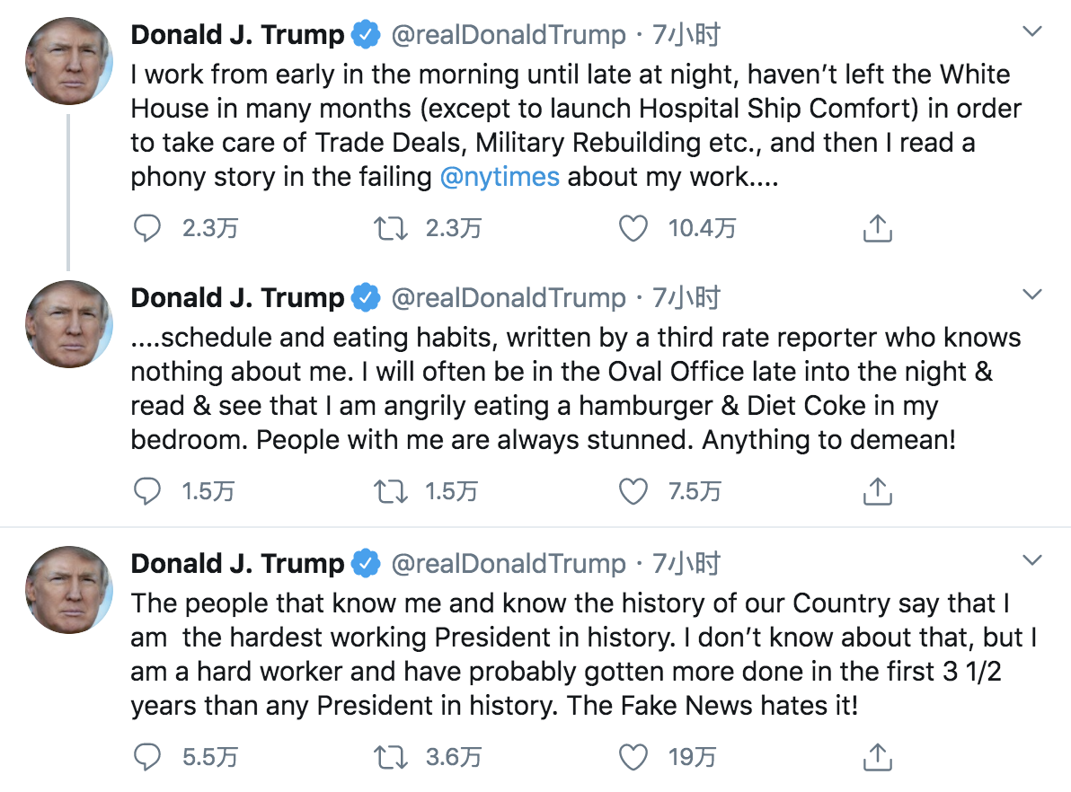 On Sunday, he said in a couple of tweets that he's a hard-working president and worked from morning until late night in the White House.