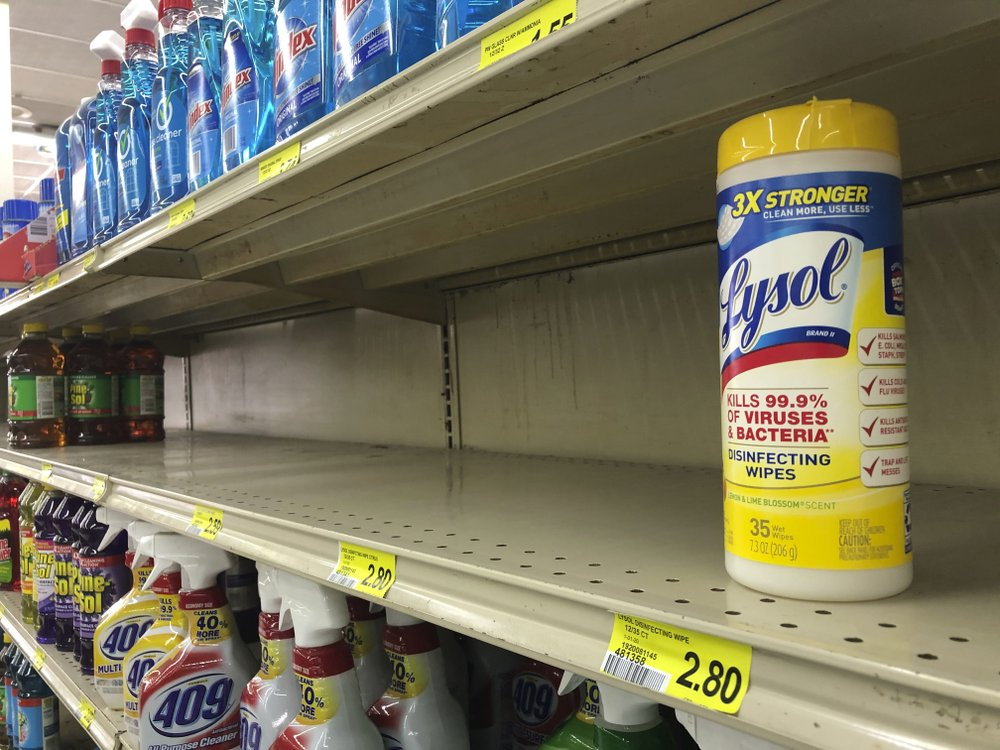 The last package of Lysol disinfectant wipes sits on a shelf at the Piggly Wiggly on North Avenue in Athens, Ga., March 13, 2020. /AP