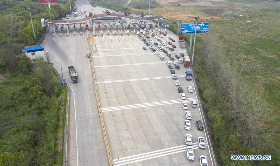 Aerial photo shows vehicles back to Wuhan wait to pass through a highway toll station in Wuhan, central China's Hubei Province, March 24, 2020. /Xinhua