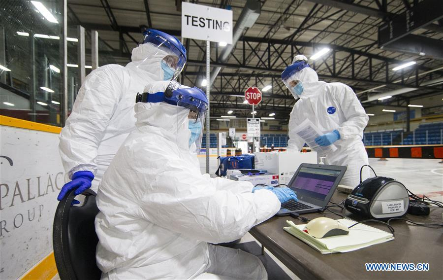 A medical worker inputs testing information at a drive-thru COVID-19 testing center in Hamilton, Ontario, Canada, April 23, 2020. /Xinhua