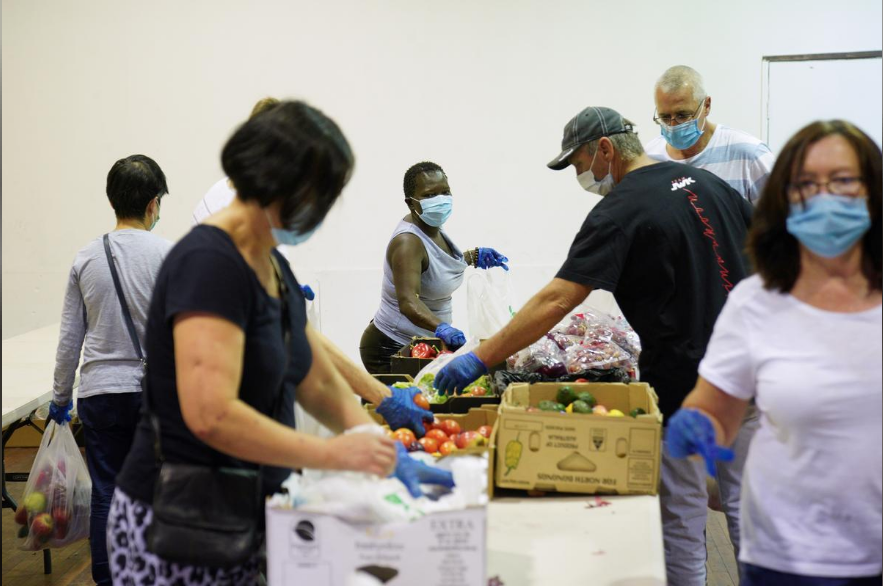 Masked church volunteers organize food donations before distributing them to those in need, during the spread of the COVID-19, Sydney, Australia, April 17, 2020. /Reuters