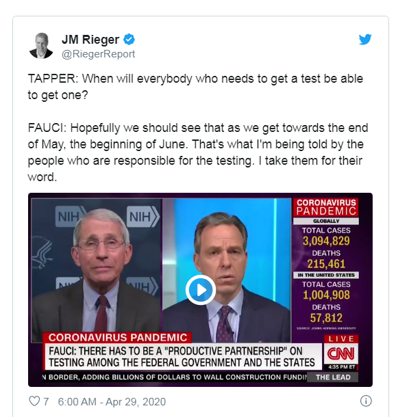Anthony Fauci, head of the National Institute of Allergy and Infectious Diseases, said every American in need of a virus test should be able to get one by the end of May or the beginning of June.