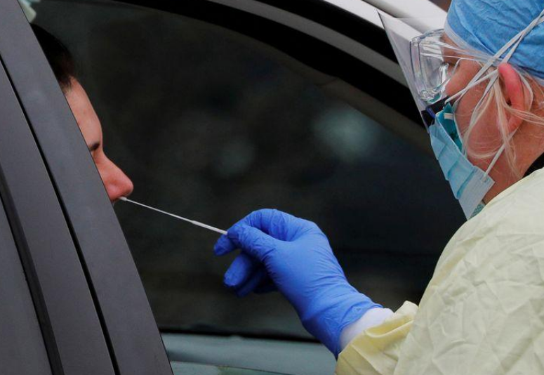A medical technician takes a sample to test for the coronavirus disease (COVID-19) at a drive through testing site in Medford, Massachusetts, U.S., April 4, 2020. /Reuters