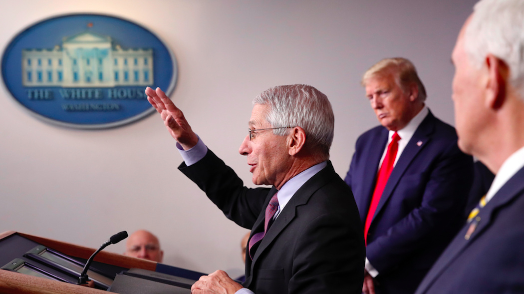 U.S. President Donald Trump and Vice President Mike Pence listen as Dr. Anotny Fauci, Director of the National Institute of Allergy and Infectious Diseases at the National Institutes of Health, speaks about the coronavirus in the James Brady Press Briefing Room of the White House, Wednesday, April 22, 2020, in Washington. /AP
