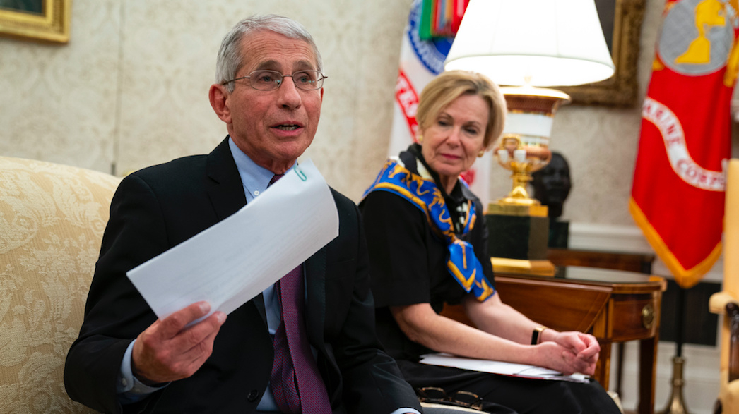 White House coronavirus response coordinator Dr. Deborah Birx (r) listens as director of the National Institute of Allergy and Infectious Diseases Dr. Anthony Fauci (l) speaks during a meeting about the coronavirus response, in the Oval Office of the White House, in Washington, April 29, 2020. /AP