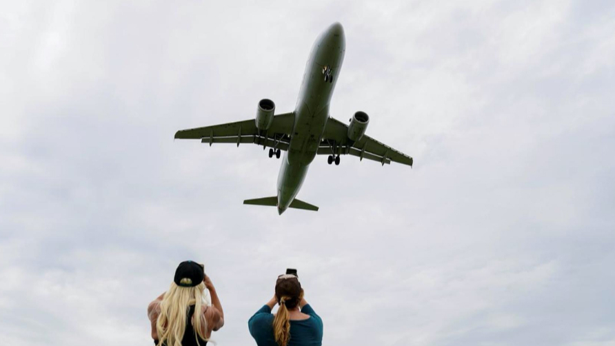 Flight attendants photograph a plane landing at Reagan National Airport during the coronavirus crisis while on a layover in Washington, U.S., April 29, 2020. /Reuters