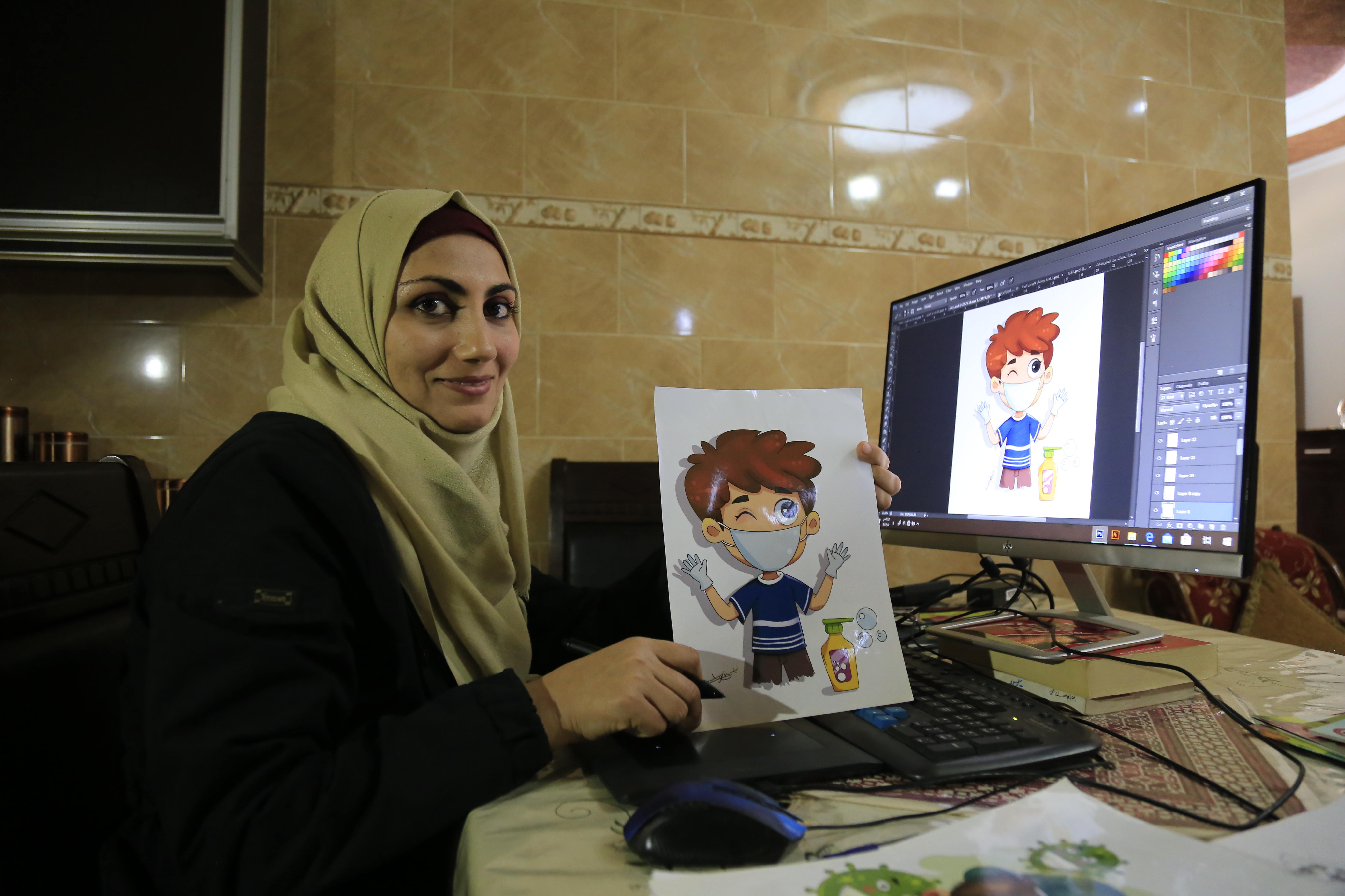 Nevfin Abu Salim from Deir al-Balah city in the central Gaza Strip found her way to creativity with cartoons with drawings that mimic the lives of citizens and urge them to take preventive measures and safety in light of the spread of COVID-19. She publishes her work on social media platforms, using a lot of colors and symbols that indicate the correct methods of prevention.
