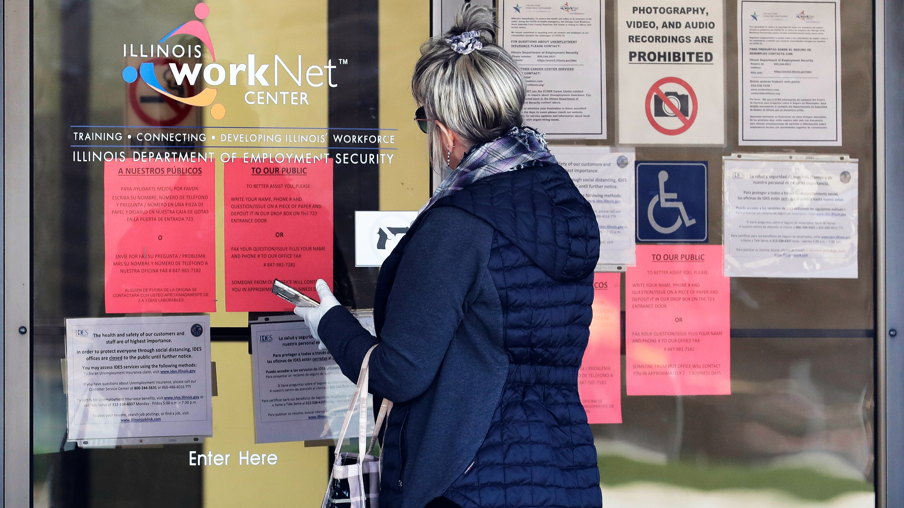 A woman checks job application information in front of IDES (Illinois Department of Employment Security)/WorkNet center in Arlington Heights, Ill., April 9, 2020. /AP