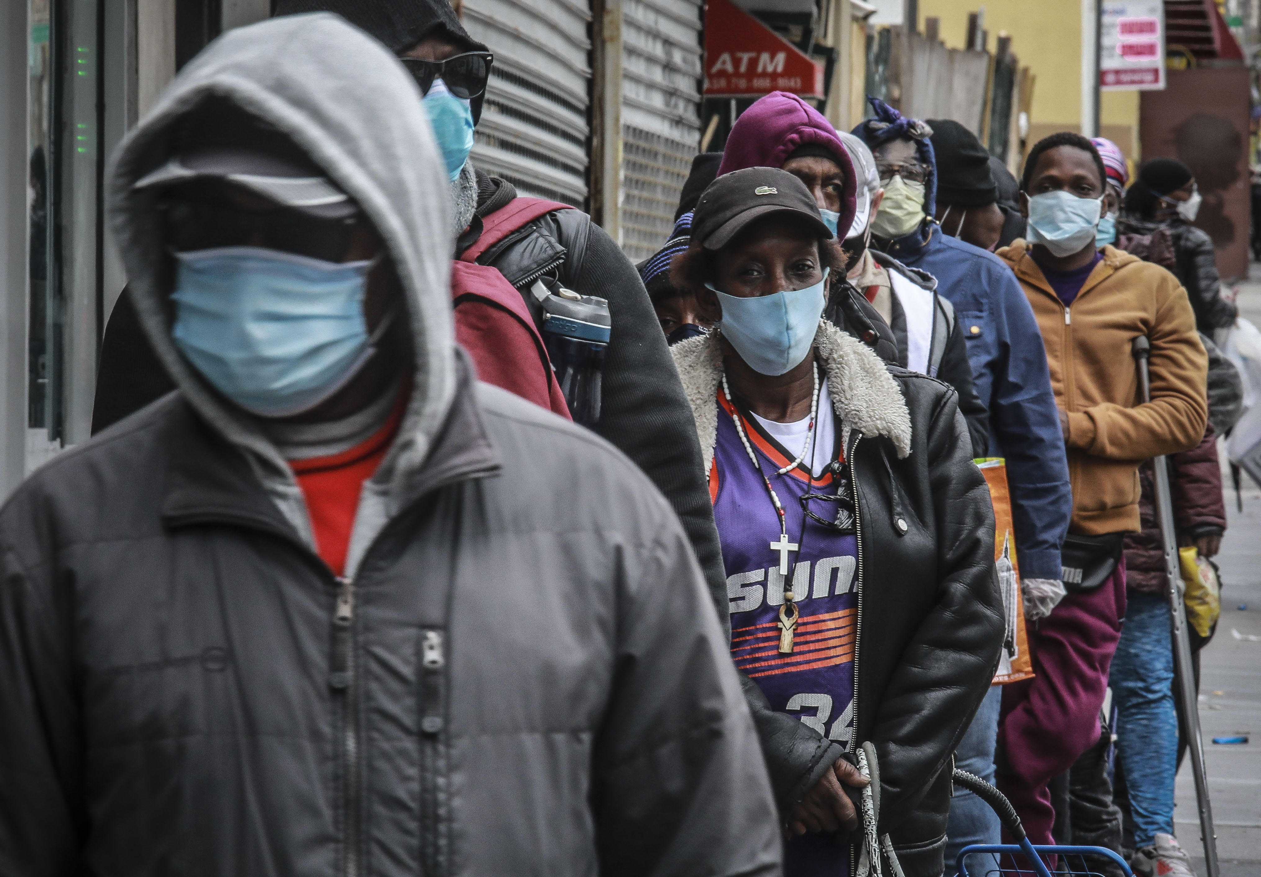 People wait for a distribution of masks and food from the Rev. Al Sharpton in the Harlem neighborhood of New York, after a new state mandate was issued requiring residents to wear face coverings in public due to COVID-19, Saturday, April 18, 2020. /AP