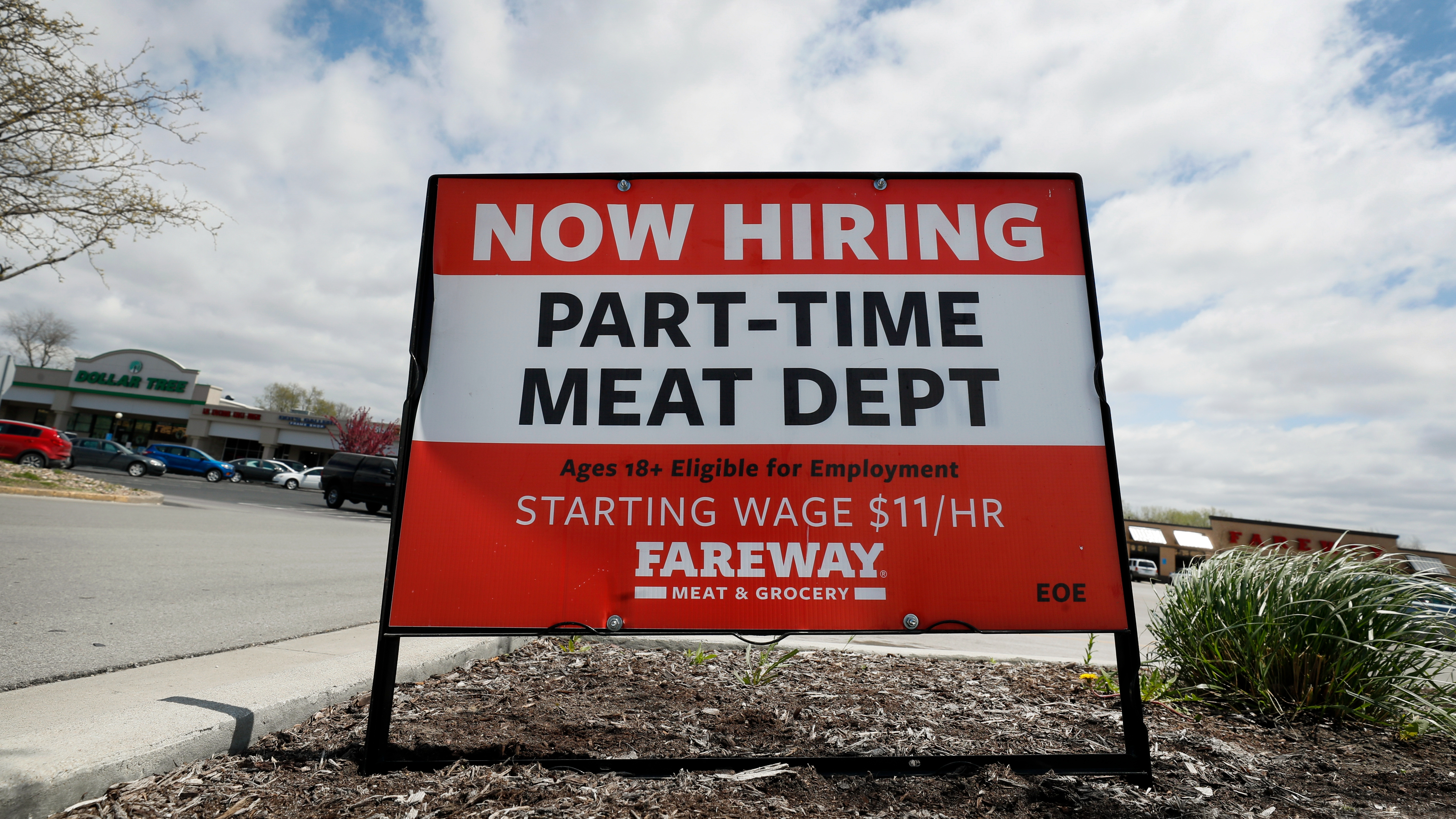 A now hiring sign is displayed in front of a grocery store, Wednesday, April 29, 2020, in Des Moines, Iowa. /AP