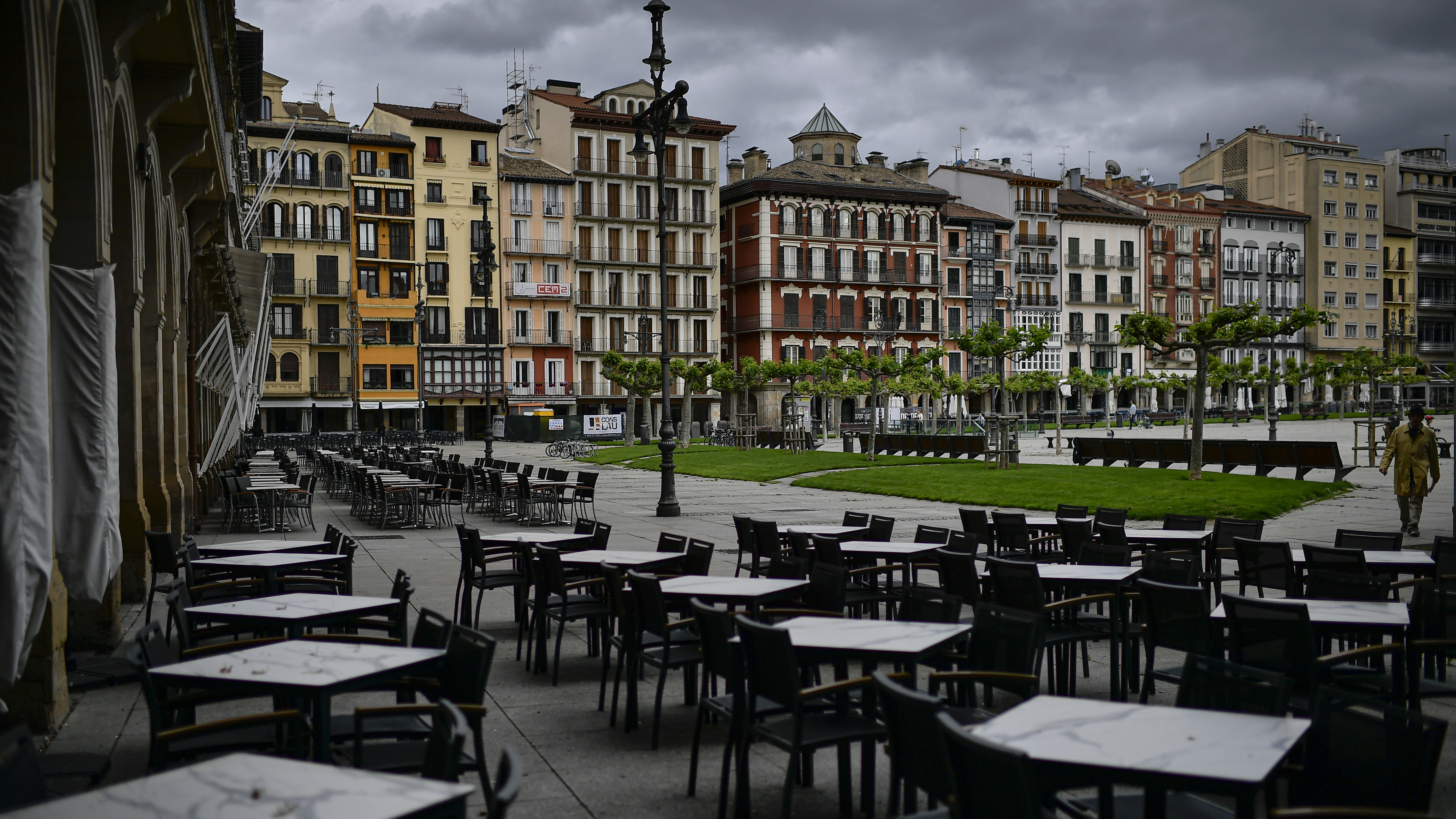 Empty tables and chairs at Plaza del Castillo square during the lockdown to prevent the spread of coronavirus, in Pamplona, northern Spain, May 1, 2020. /AP