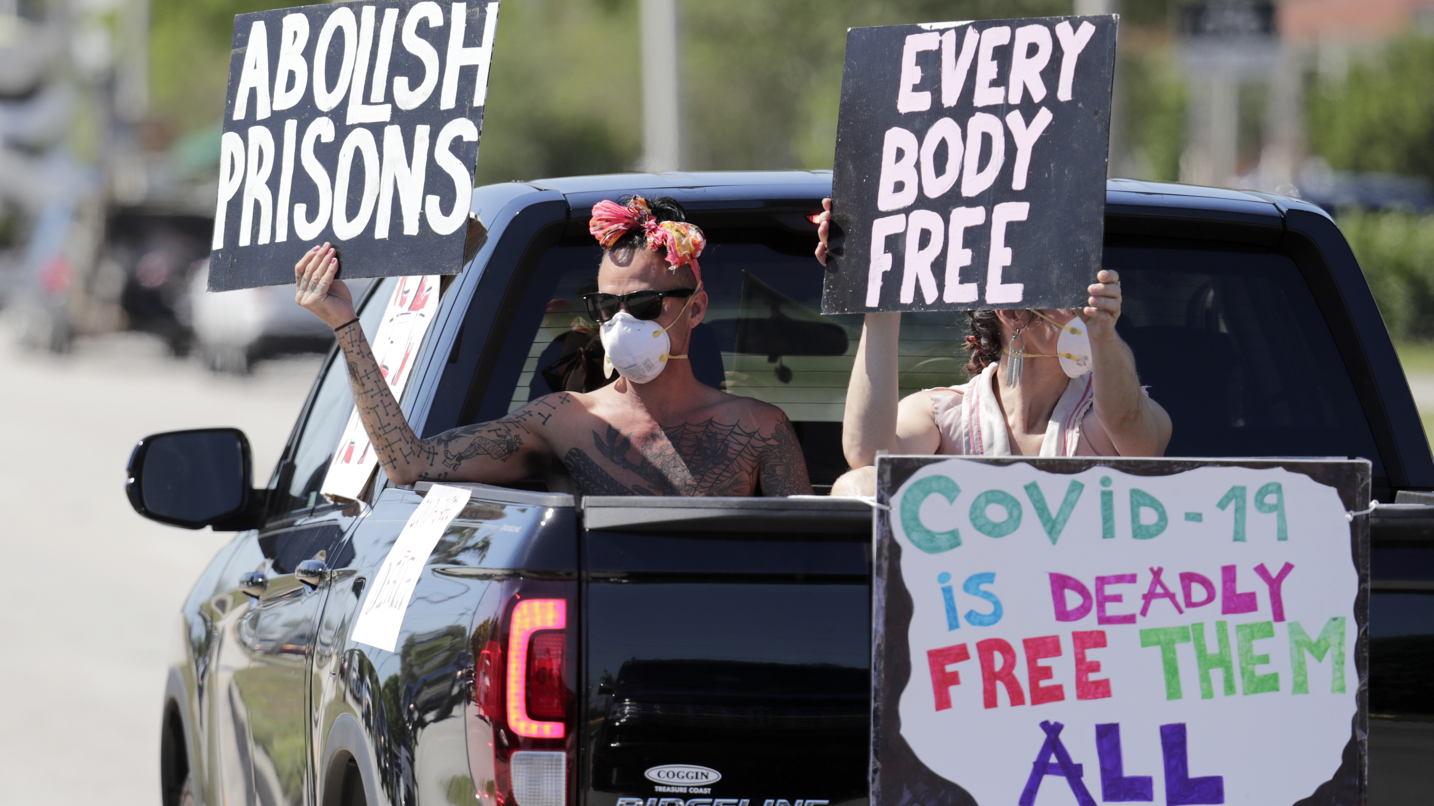 E. Goldman, left, and Alex Berkman, right, ride in a caravan to protest conditions that detainees being held by Immigration and Customs Enforcement face outside of the Broward Transitional Center, during the new coronavirus pandemic, Friday, May 1, 2020, in Pompano Beach, Fla. / AP photo