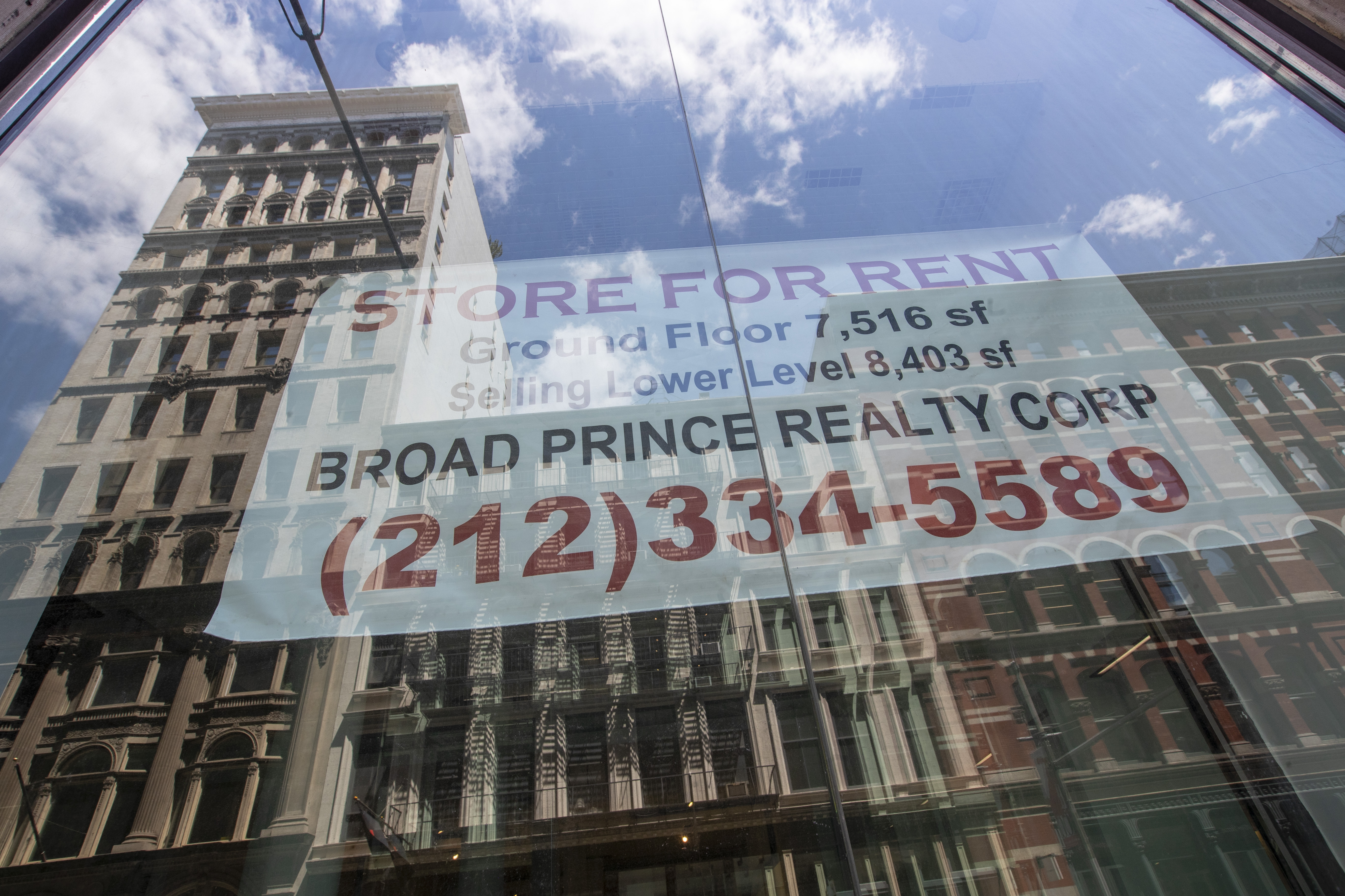 A store for rent sign hangs in the window of an empty storefront on Broadway in the Soho neighborhood of Manhattan in New York, U.S., May 7, 2020. /AP