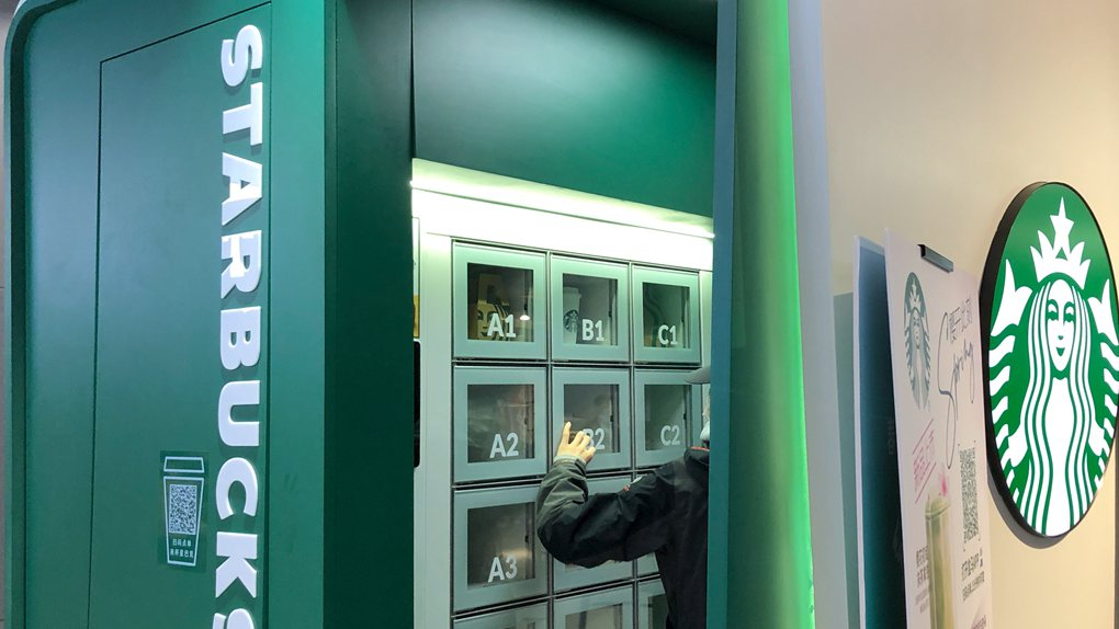 A Starbucks non-contact self-service vending machine in Alibaba's offline Hema supermarket, Beijing, China, April 4, 2020. /VCG