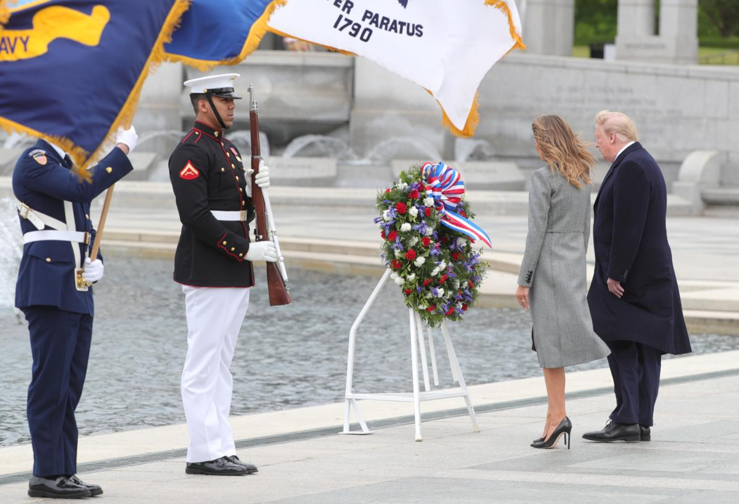 U.S. President Donald Trump and First Lady Melania Trump stand in front of a wreath during the VE Day anniversary ceremony in Washington, U.S., May 8, 2020. / Reuters