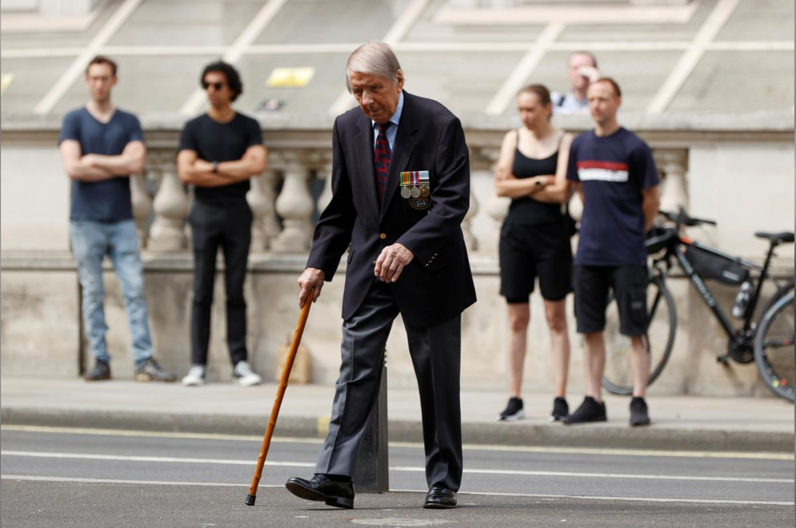A veteran is applauded at the Centaph in Westminister during a two minute silence on the 75th Anniversary of VE Day in London, Britain, May 8, 2020. /Reuters