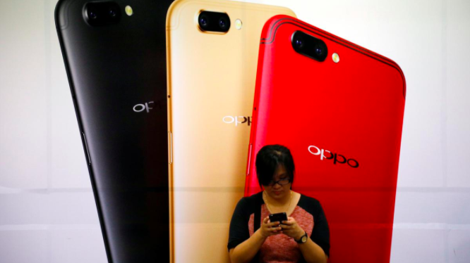 A woman uses her mobile phone next to an Oppo mobile handset advertisement in Singapore August 7, 2017. /Reuters