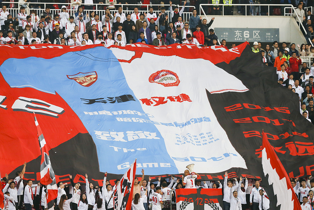 Quanjian fans cheer for the squad during CSL game against Shanghai SIPG in Tianjin, November 11, 2018. /VCG