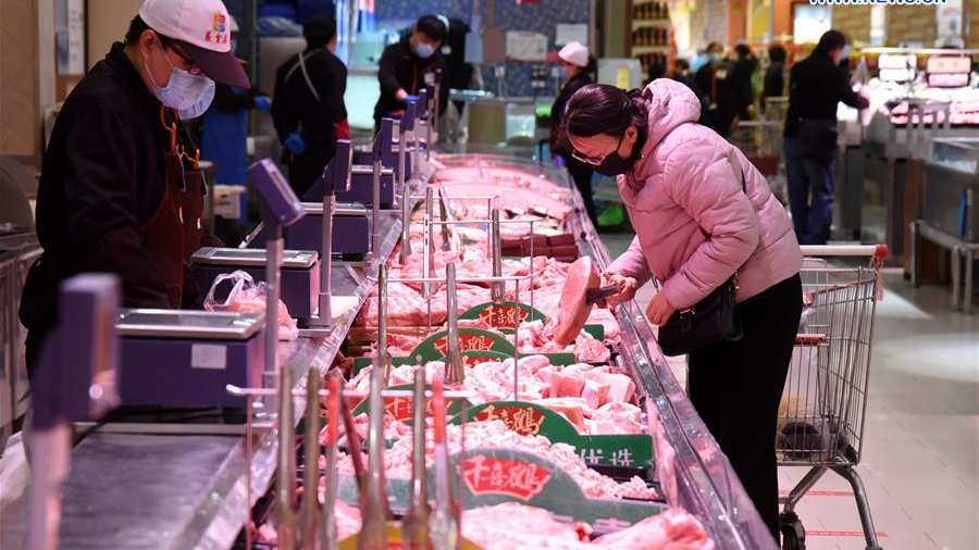A consumer(R) selects meat at a supermarket in Handan, north China's Hebei Province, April 10, 2020. /Xinhua