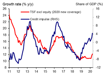 Credit growth picks up further to 12.2 percent y/y, while credit impulse continues to rebound. /CEIC, UBS estimates