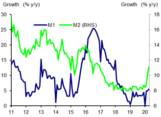 M2 growth jumps further to 11.1 percent y/y thanks to a big increase in deposits, while M1 growth edges up. /CEIC, UBS estimates