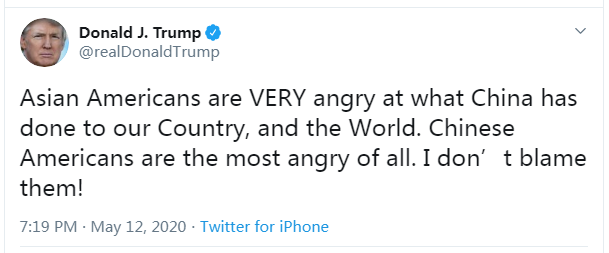 Screenshot of U.S. President Donald Trump's tweet on China, May 12, 2020.