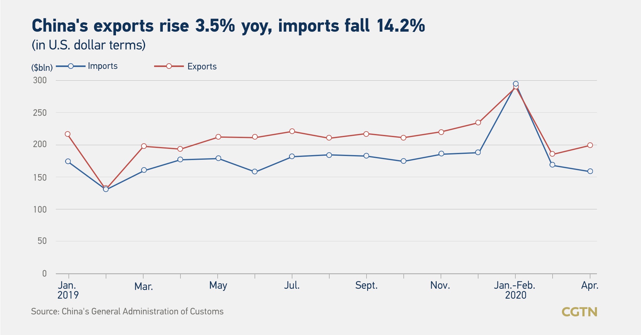 That is a far cry from a Reuters poll, which projected April imports and exports would suffer double-digit setbacks of 11.2 percent and 15.7 percent, respectively, following tentative tweaks in March, while Bloomberg forecast that the contraction in China's foreign trade is set to continue through the second quarter.