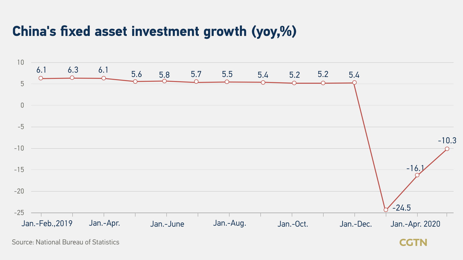 Weighed on by the flare-up of infections and uncertainties clouding overseas outbreaks, China's fixed-asset investment during the January-April period contracted by 10.3 percent, but it still pared a year-on-year decline of 16.1 percent in the first quarter of 2020.