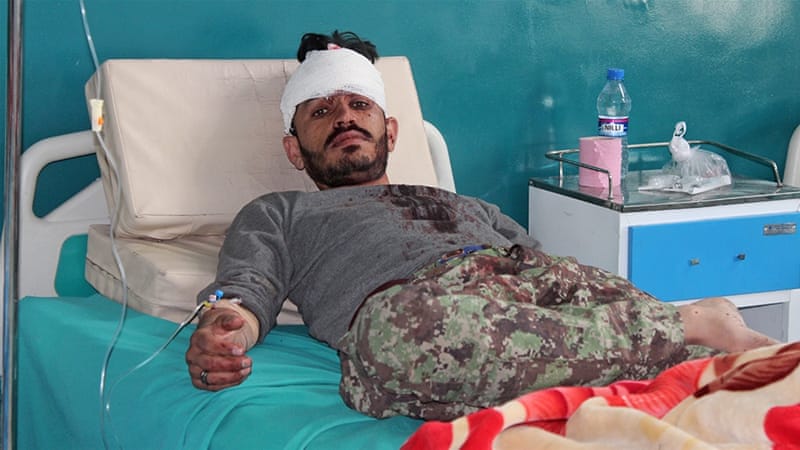 A wounded Afghan National Army (ANA) soldier rests in a hospital after a truck bomb attack in Gardez, capital of Paktia province, Afghanistan, May 14, 2020. /AFP