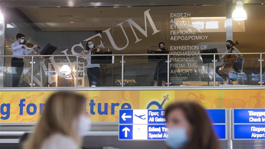 Members of the Youth Symphony Orchestra of Greece performed at the Athens International Airport "Eleftherios Venizelos" to celebrate the day and greet travelers as the airport gears up for the delayed tourism season this summer.