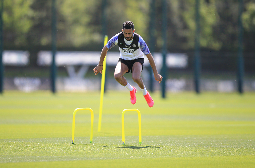 Manchester City's Riyad Mahrez in action during training at Manchester City Football Academy, Manchester, England, May 27, 2020. /VCG
