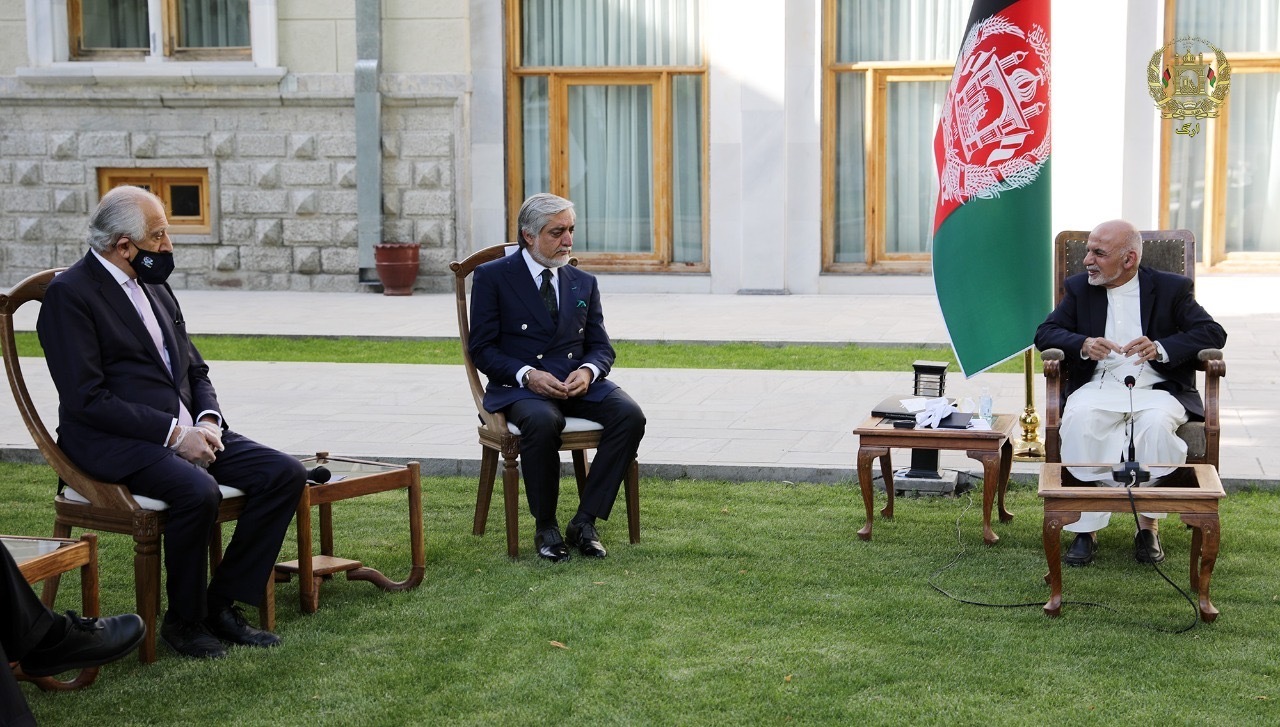 Afghan President Ashraf Ghani, right, and fellow leader under a recently signed power-sharing agreement, Abdullah Abdullah, center, hold a meeting with U.S. peace envoy Zalmay Khalilzad aimed at resuscitating a U.S.-Taliban peace deal signed in February, at the Presidential Palace, in Kabul, Afghanistan, on May 20, 2020. /AP