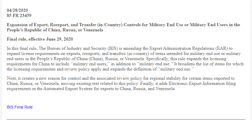 Screenshot of U.S. Export Administration Regulations amendment notice on U.S. Bureau of Industry and Security's official website.